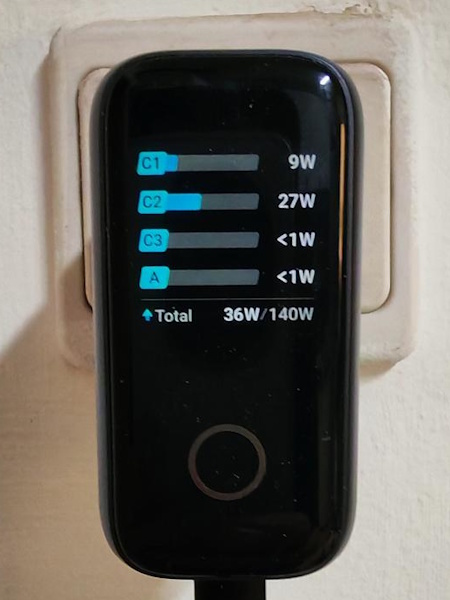 יש סיבה מאוד ברורה ומיידית לכך שאנקר בחרה את סגנון חיבור הכבלים הזה. ל-Anker Charger 140W יש מאחור תצוגה גרפית נחמדה מאוד, דרך אגב. זה מתחיל בפרצוף מחייך שמופיע לשתיים/שלוש שניות בעת שמכניסים את התקע למקום, ואחר כך בלחיצה על כפתור המגע מתחת לתצוגה אפשר לעבור בין כמה מצבים.