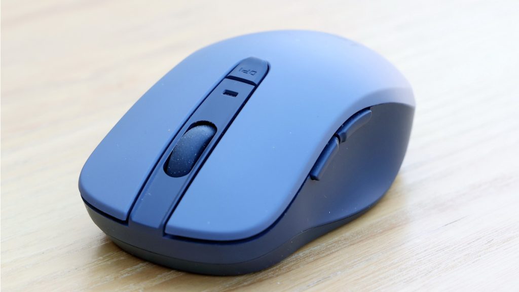 בחלק העליון של העכבר, מעבר לכפתורים הצפויים – שני הכפתורים הראשיים, שני כפתורי הצד והגלגלת הלחיצה – יש מעל הגלגלת כפתור חמישי נוסף שמאפשר לבחור את ה-DPI של העכבר, ויש שלוש רמות לבחירה: מהירות של 800, 1,200 ו-1,600 נקודות לאינץ'. אני בחרתי את המהירות הגבוהה ביותר ונשארתי שם, אבל זה באמת שאלה של הרגל. בין הכפתור הזה לגלגלת יש נורית שדולקת בכחול שהכל מחובר ובסדר, ומשנה את צבעה לאדום כדי לאותת על בעיה, בדרך כלל על קצה חיי הסוללה.