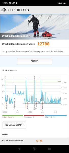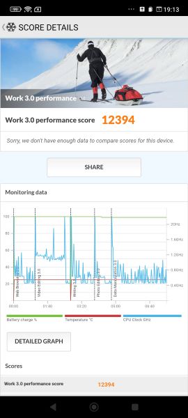 ואיך זה משפיע על הביצועים של הטלפון? השתמשתי קודם כל שוב ב-PCMark במבחן הביצועים שלו, והרי התוצאות בסידור שמיושר עם מסכי זמן העבודה לעיל.