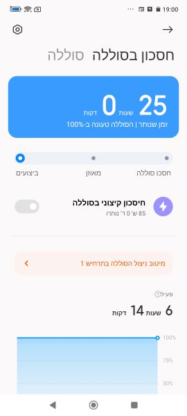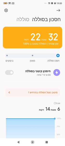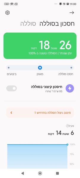 כך או כך, גם תחת MIUI 14, אי אפשר היה לומר שזו מערכת הפעלה, או ממשק ליתר דיוק, שאינה מספקת אפשרויות רבות בעמוד ההגדרות. אחת מהן היא אפשרות לעבור בקלות, כמעט כמו ב-Windows 11 להבדיל, בין מצב העבודה של הטלפון בהיבט של הסוללה: לחסוך בסוללה, לעבוד באופן מאוזן ולעבוד במצב ביצועים. אז במבט ראשון, אחרי הטענה של הטלפון ל-100%, הצצתי לראות מהו הזמן שהמערכת מעריכה שנותר לעבודה בהתאם למצב הנבחר.