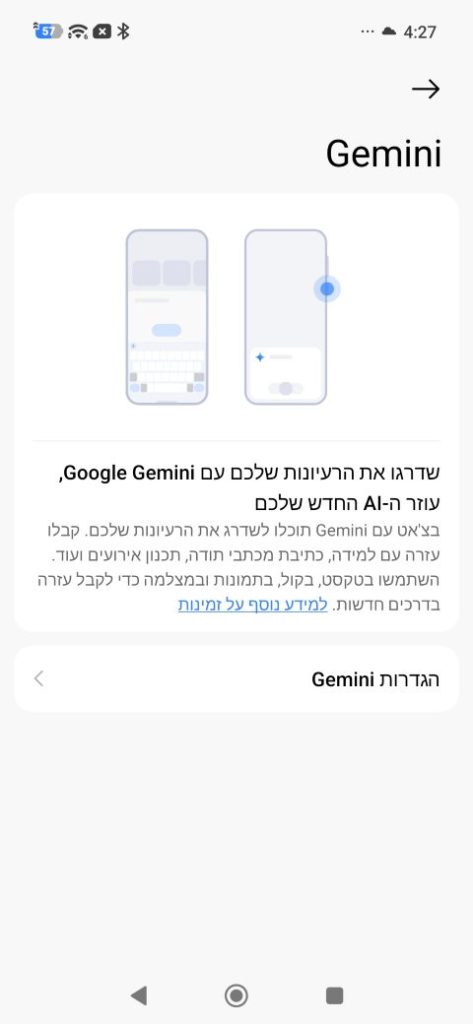 למעשה זה יותר מדריך ל-AI שמציע הטלפון מאשר הגדרות של ממש. לצד זה שהוא מזכיר איך להפעיל ישירות את Gemini של גוגל, במקום להשתמש באפליקציה שמותקנת בטלפון כברירת מחדל – וגם מאפשר לראות כל מה שאפשר לעשות כיום הכלי – מוצאים תחת האצת יישום AI את מה ששאומי מציעה מהצד שלה.