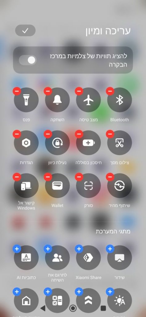 כדי להוסיף פעולה מהירה לרשימה לחצו על הפלוס הכחול שמוצג על הצלמית שלה. כדי לגרוע פעולה שכבר כלולה ברשימה, לחצו על המינוס האדום שעל פני הצלמית שלה.