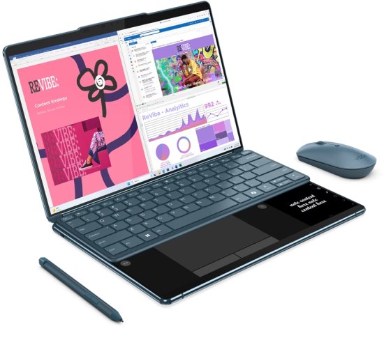גרסת 2024 של Yoga Book 9i מציע שדרוג קל לדור הקודם – וזה אומר בין השאר אותם שני מסכי OLED בגודל 13.3 אינץ' ברזולוציית 2.8K שמציעים פשוט תמונה נהדרת, גם בזכות התמיכה ב-Dolby Vision, אבל חבל שקצב הריענון לא עודכן אל מעבר לקצב הבסיסי של 60 הרץ, מקלדת בלוטות' ניידת וחרט שמגיעים כחלק מהאריזה הנהדרת, והרבה מצבי עבודה מגוונים שחלקם מבוססים על המקלדת הווירטואלית שיכולה להופיע על המסך התחתון.